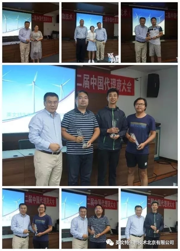 大会对这一年来优秀代理商进行了颁奖,其中北京友谊中联公司凭借稳定的销售团队对北京业绩翻倍做出的贡献获得了腾飞奖,沈阳海灵公司凭借扎实的学术根基,进行东北三省销售新模式的开发,获得了学术典范奖;上海拓然生物公司刚刚进入英文特团队,但具有极强的爆发力获得了新秀奖。济南柠檬生物公司,杭州奥谦生物公司,石家庄健菲生物公司获得了最佳合作伙伴奖。